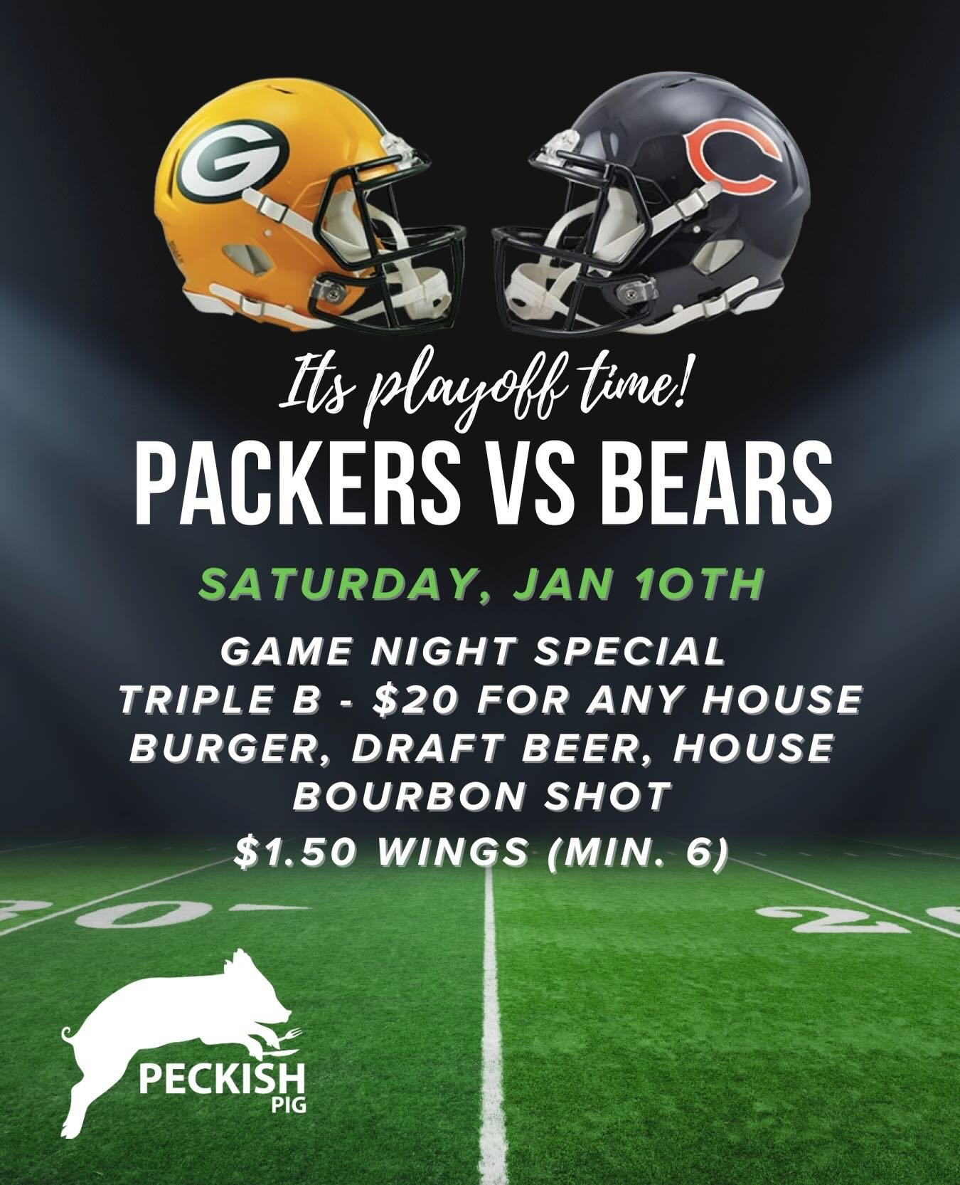 Planning for the weekend?! Join us for the Bears game this Saturday night - Jan 10th, and enjoy some very special deals including TRIPLE B - Beer, Burger, Bourbon for $20 or $1.50 wings!