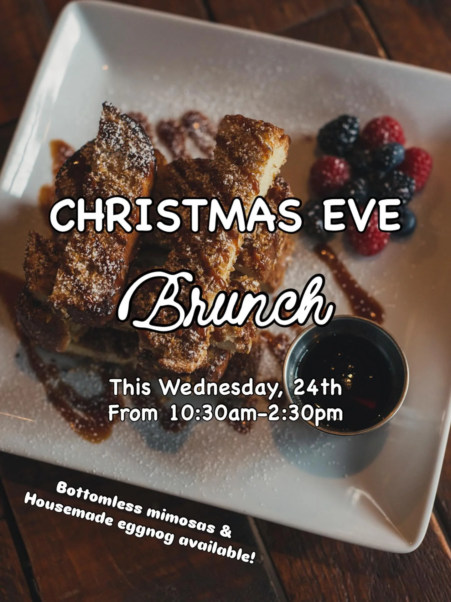 View fullsize Got family in town but want to keep the kitchen clean before Christmas? Come on in and join us for a special Holiday Christmas Eve brunch! This Wednesday, from 10:30am-2:30pm we’ll have bottomless mimosas, house made eggnog and your favorite br