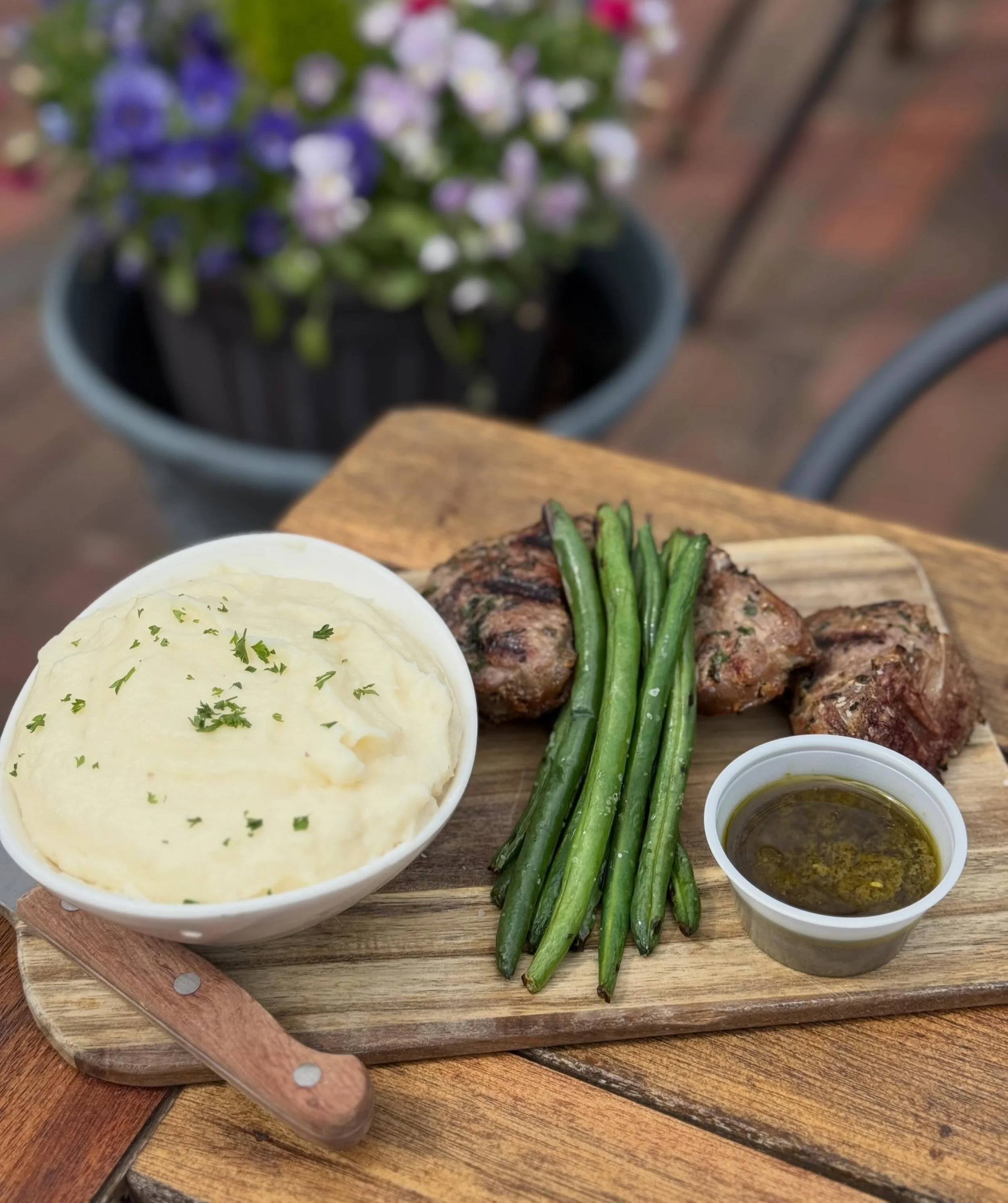 Seated lamb loins with a house made mint chimichurri, sautéed lemon green beans and mashed potato with kerrygold butter ๐Ÿคค